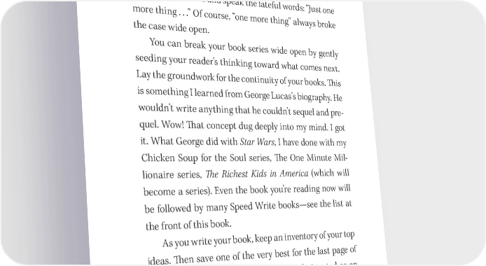 Write a GREAT Book! 65 In Peter Falk’s classic TV series, the rumpled detec- tive Lieutenant Columbo always seemed to be letting the guilty party o昀昀 the hook at the end of an interrogation— but just as he was opening the door to leave, he’d always turn slowly around and speak the fateful words: “Just one more thing . . .” Of course, “one more thing” always broke the case wide open. You can break your book series wide open by gently seeding your reader’s thinking toward what comes next. Lay the groundwork for the continuity of your books. 吀栀is is something I learned from George Lucas’s biography. He wouldn’t write anything that he couldn’t sequel and pre- quel. Wow! 吀栀at concept dug deeply into my mind. I got it. What George did with Star Wars, I have done with my Chicken Soup for the Soul series, 吀栀e One Minute Mil- lionaire series, 吀栀e Richest Kids in America (which will become a series). Even the book you’re reading now will be followed by many Speed Write books—see the list at the front of this book. As you write your book, keep an inventory of your top ideas. 吀栀en save one of the very best for the last page of your 昀椀nished manuscript. 吀栀is can be designated as an epilogue, or it can just be part of your concluding chapter. But always leave the reader with a wow experience just before “吀栀e End.”