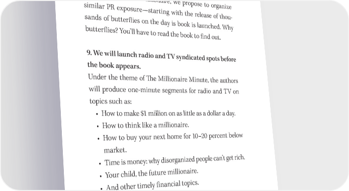 166 You Have a Book in You Because of this and other promotions, Publishers Weekly listed Nothing Down as the number 11 hardcover non昀椀ction best seller for the entire decade of the 1980s. For 吀栀e One Minute Millionaire, we propose to organize similar PR exposure—starting with the release of thou- sands of butter昀氀ies on the day is book is launched. Why butter昀氀ies? You’ll have to read the book to 昀椀nd out. 9. We will launch radio and TV syndicated spots before the book appears. Under the theme of 吀栀e Millionaire Minute, the authors will produce one- minute segments for radio and TV on topics such as: • How to make $1 million on as little as a dollar a day. • How to think like a millionaire. • How to buy your next home for 10–20 percent below market. • Time is money: why disorganized people can’t get rich. • Your child, the future millionaire. • And other timely 昀椀nancial topics. 吀栀e tagline will encourage people to visit the OneMinute Millionaire.com website to learn more about 昀椀nancial success. Each visitor will enter their email address and will receive noti昀椀cation about 吀栀e One Min- ute Millionaire book.