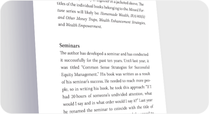 Missed Fortune: A Sample Proposal 143 First O昀케cial Edition Enclosed 吀栀e author has just released the o昀케cial 昀椀rst edition, which was printed on June 20. 吀栀e book is also being divided into a series of four smaller books, which can be purchased separately or together in a jacketed sleeve. 吀栀e titles of the individual books belonging to the Missed For- tune series will likely be: Homemade Wealth, IRA/401(k) and Other Money Traps, Wealth Enhancement Strategies, and Wealth Empowerment. Seminars 吀栀e author has developed a seminar and has conducted it successfully for the past ten years. Until last year, it was titled “Common Sense Strategies for Successful Equity Management.” His book was written as a result of his seminar’s success. He needed to reach more peo- ple, so in writing his book, he took this approach: “If I had 20 hours of someone’s undivided attention, what would I say and in what order would I say it?” Last year he renamed the seminar to coincide with the title of the book. 吀栀e book has greatly enhanced the appeal to the attendee, who now can purchase a copy and study the concepts in more depth. Attendees comment that they do not feel at all pressured to buy the book, yet an average of 83 percent and as many as 100 percent have purchased books following each seminar. 吀栀e author