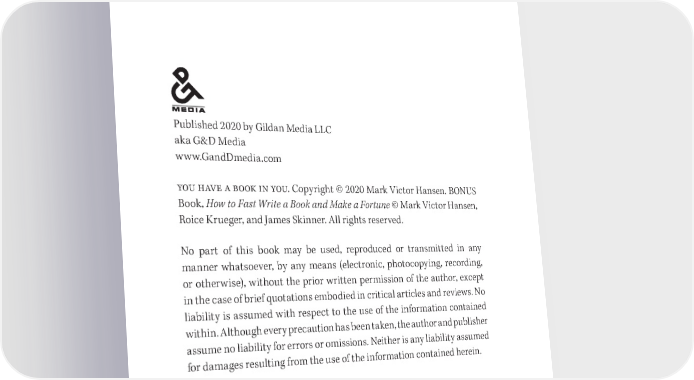 Published 2020 by Gildan Media LLC aka G&D Media www.GandDmedia.com you have a book in you. Copyright © 2020 Mark Victor Hansen. BONUS Book, How to Fast Write a Book and Make a Fortune © Mark Victor Hansen, Roice Krueger, and James Skinner. All rights reserved. No part of this book may be used, reproduced or transmitted in any manner whatsoever, by any means (electronic, photocopying, recording, or otherwise), without the prior written permission of the author, except in the case of brief quotations embodied in critical articles and reviews. No liability is assumed with respect to the use of the information contained within. Although every precaution has been taken, the author and publisher assume no liability for errors or omissions. Neither is any liability assumed for damages resulting from the use of the information contained herein. Front cover design by David Rheinhardt of Pyrographx Interior design by Meghan Day Healey of Story Horse, LLC Library of Congress Cataloging- in- Publication Data is available upon request ISBN: 978- 1- 7225- 0261- 4 10 9 8 7 6 5 4 3 2 1