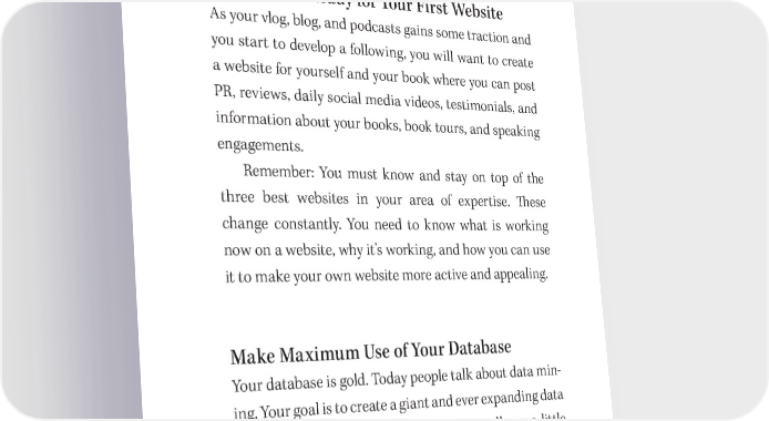 Marketing Your Best Seller 107 and pictures to commemorate, publicize, and immortal- ize our success. When You’re Ready for Your First Website As your vlog, blog, and podcasts gains some traction and you start to develop a following, you will want to create a website for yourself and your book where you can post PR, reviews, daily social media videos, testimonials, and information about your books, book tours, and speaking engagements. Remember: You must know and stay on top of the three best websites in your area of expertise. 吀栀ese change constantly. You need to know what is working now on a website, why it’s working, and how you can use it to make your own website more active and appealing. Make Maximum Use of Your Database Your database is gold. Today people talk about data min- ing. Your goal is to create a giant and ever expanding data list to mine and remine forever. Let me tell you a little secret: you won’t make the most money by selling your book—unless you sell millions and millions of copies, or have a book that sells for $1,000 per copy and you sell over 1,000 copies (yes, books like that do exist!). You are going to make your real money from your database. How?