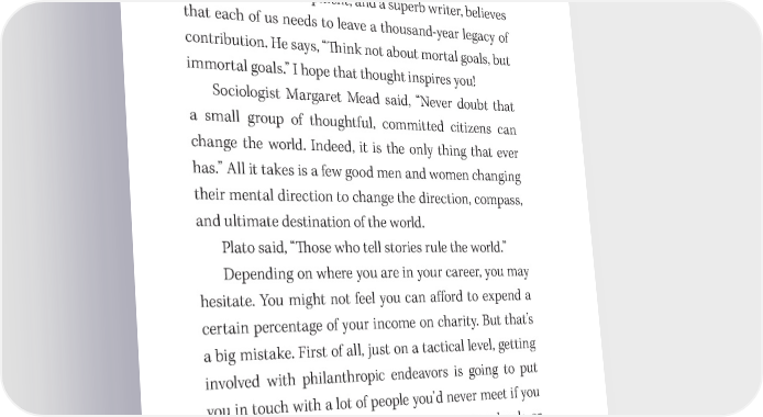 102 You Have a Book in You and sales would skyrocket. Proli昀椀c writers might even write a book and contribute all the pro昀椀ts to a cause they believe in. In turn, this could create a legacy that would go on forever. John Demartini, my great friend, a special- ist in personal development, and a superb writer, believes that each of us needs to leave a thousand- year legacy of contribution. He says, “吀栀ink not about mortal goals, but immortal goals.” I hope that thought inspires you! Sociologist Margaret Mead said, “Never doubt that a small group of thoughtful, committed citizens can change the world. Indeed, it is the only thing that ever has.” All it takes is a few good men and women changing their mental direction to change the direction, compass, and ultimate destination of the world. Plato said, “吀栀ose who tell stories rule the world.” Depending on where you are in your career, you may hesitate. You might not feel you can a昀昀ord to expend a certain percentage of your income on charity. But that’s a big mistake. First of all, just on a tactical level, getting involved with philanthropic endeavors is going to put you in touch with a lot of people you’d never meet if you stu昀昀ed your money into a Prince Albert can, a bank, or your mattress. 吀栀ose people might really help you. Second, if you tell yourself that you can’t a昀昀ord to be charitable, you are falling into the trap of scarcity con- sciousness, which will not help you generate abundance. Scarcity thinking repels abundance. See my best seller