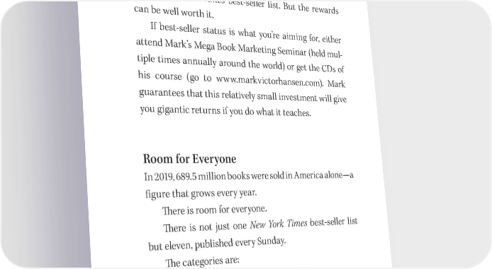 How to Fast Write a Book and Make a Fortune 249 Decide whether or not you want to make the e昀昀ort and pay the price to make your book a best seller. It can take as much as a year and a half of relentless work to make your dream happen and get to number one on the New York Times best- seller list. But the rewards can be well worth it. If best- seller status is what you’re aiming for, either attend Mark’s Mega Book Marketing Seminar (held mul- tiple times annually around the world) or get the CDs of his course (go to www.markvictorhansen.com). Mark guarantees that this relatively small investment will give you gigantic returns if you do what it teaches. Room for Everyone In 2019, 689.5 million books were sold in America alone—a 昀椀gure that grows every year. 吀栀ere is room for everyone. 吀栀ere is not just one New York Times best- seller list but eleven, published every Sunday. 吀栀e categories are: 1. Combined print and ebook 昀椀ction 2. Combined print and ebook non昀椀ction 3. Hardcover 昀椀ction 4. Hardcover non昀椀ction 5. Paperback trade 昀椀ction 6. Paperback non昀椀ction