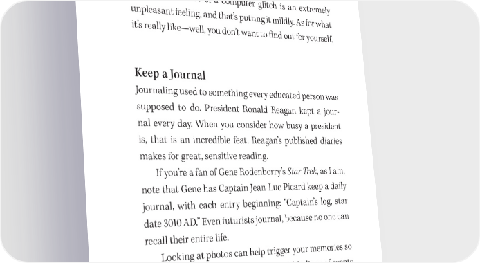 Write a GREAT Book! 63 you’ll have it if, God forbid, it disappears inadvertently from your computer. You and I cannot a昀昀ord the time to redo an entire book. Protect your work like this every day! Having your book disappear because of a computer glitch is an extremely unpleasant feeling, and that’s putting it mildly. As for what it’s really like—well, you don’t want to 昀椀nd out for yourself. Keep a Journal Journaling used to something every educated person was supposed to do. President Ronald Reagan kept a jour- nal every day. When you consider how busy a president is, that is an incredible feat. Reagan’s published diaries makes for great, sensitive reading. If you’re a fan of Gene Rodenberry’s Star Trek, as I am, note that Gene has Captain Jean- Luc Picard keep a daily journal, with each entry beginning: “Captain’s log, star date 3010 AD.” Even futurists journal, because no one can recall their entire life. Looking at photos can help trigger your memories so you can better capture the essence and feelings of events as you write about them. Put some of your pictures in your journal. 吀栀ey can also be stored on your computer, or on di昀昀erent websites. In the past, journaling was seen as a matter of personal discipline. If some self- revelation