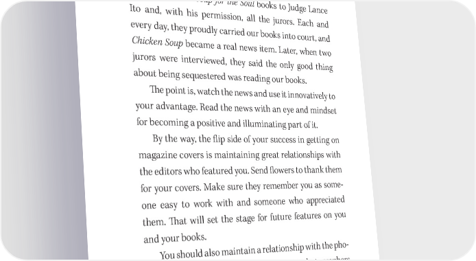 Marketing Your Best Seller 129 During the O. J. Simpson murder trial, jury members were not allowed to read newspapers, watch TV, or lis- ten to any news reports. However, they could read books. For Jack and me, it was a perfect opportunity to shine. We sent Chicken Soup for the Soul books to Judge Lance Ito and, with his permission, all the jurors. Each and every day, they proudly carried our books into court, and Chicken Soup became a real news item. Later, when two jurors were interviewed, they said the only good thing about being sequestered was reading our books. 吀栀e point is, watch the news and use it innovatively to your advantage. Read the news with an eye and mindset for becoming a positive and illuminating part of it. By the way, the 昀氀ip side of your success in getting on magazine covers is maintaining great relationships with the editors who featured you. Send 昀氀owers to thank them for your covers. Make sure they remember you as some- one easy to work with and someone who appreciated them. 吀栀at will set the stage for future features on you and your books. You should also maintain a relationship with the pho- tographers who shot your pictures. 吀栀ese photographers are often freelancers, meaning they probably photograph the covers of many di昀昀erent magazines. If would be nice if your name were on their minds when they hear of other publications looking for a cover story.