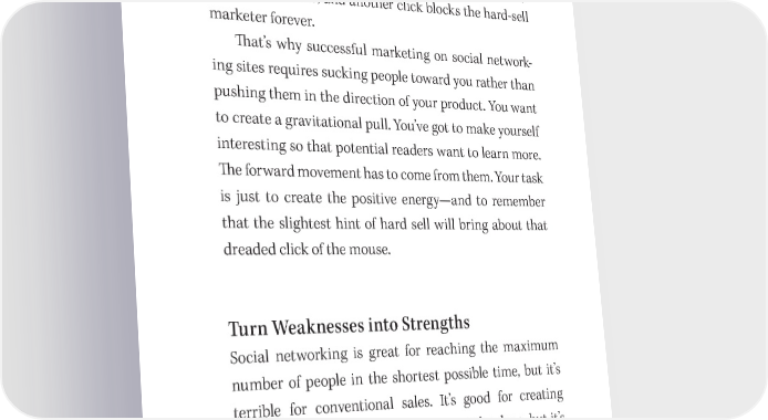 The Power of Social Networking . . . 199 an answer could sell a lot of products. 吀栀e client would buy something just to get out of the store. But on the Internet, getting out of the store couldn’t be easier. A click of the mouse takes you to an entirely di昀昀erent universe, and another click blocks the hard- sell marketer forever. 吀栀at’s why successful marketing on social network- ing sites requires sucking people toward you rather than pushing them in the direction of your product. You want to create a gravitational pull. You’ve got to make yourself interesting so that potential readers want to learn more. 吀栀e forward movement has to come from them. Your task is just to create the positive energy—and to remember that the slightest hint of hard sell will bring about that dreaded click of the mouse. Turn Weaknesses into Strengths Social networking is great for reaching the maximum number of people in the shortest possible time, but it’s terrible for conventional sales. It’s good for creating awareness of who you are and what you’ve done, but it’s a lot less e昀昀ective for actually exchanging your product for money. 吀栀is can work to your advantage if you under- stand that you’re creating relationships, not just buyers. When you actually do build friendships, as Facebook suggests, your social networking friends will hopefully do