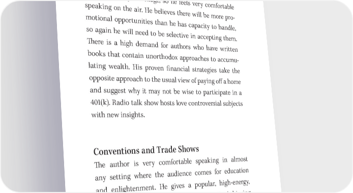 146 You Have a Book in You Talk Shows 吀栀e author has participated in several talk shows on var- ious topics. He has had extensive training in radio speak- ing and oratory in college, so he feels very comfortable speaking on the air. He believes there will be more pro- motional opportunities than he has capacity to handle, so again he will need to be selective in accepting them. 吀栀ere is a high demand for authors who have written books that contain unorthodox approaches to accumu- lating wealth. His proven 昀椀nancial strategies take the opposite approach to the usual view of paying o昀昀 a home and suggest why it may not be wise to participate in a 401(k). Radio talk show hosts love controversial subjects with new insights. Conventions and Trade Shows 吀栀e author is very comfortable speaking in almost any setting where the audience comes for education and enlightenment. He gives a popular, high- energy, 60- minute presentation titled, “Ten Keys to Achieving a Meaningful Transformation to [the organization’s top sales level] and Beyond!” He can adapt this talk to any sales organization relying upon sales, from cosmetics to insurance. No matter what the audience demographics are, attendees buy the book afterward.