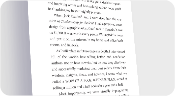 Write a GREAT Book! 19 that it can mean to you, to your loved ones, and to the world. It costs no more to dream big and have high expec- tations for yourself. Do this faithfully every night for one month. By the month’s end, you will have given yourself the autosuggestion that will make you a decisively great and inspiring writer and best- selling author. Soon you’ll be thanking me in your nightly prayers. When Jack Can昀椀eld and I were deep into the cre- ation of Chicken Soup for the Soul, I had a proposed cover design from a graphic artist that I met in Canada. It cost us $1,500. It was worth every penny. We copied the cover and put it on the mirrors in my home and o昀케ce bath- rooms, and in Jack’s. As I will relate in future pages in depth, I interviewed 101 of the world’s best- selling 昀椀ction and non昀椀ction authors, not on how to write, but on how they e昀昀ectively and successfully marketed their best sellers. From their wisdom, insights, ideas, and how- tos, I wrote what we called a WOW OF A BOOK BUSINESS PLAN, aimed at selling a million and a half books in a year and a half. Most importantly, we were visually impregnating the end result of becoming New York Times best- selling authors in our minds as a completed task. Dr. M. Scott Peck, a colleague of Jack’s from Harvard, had been at number one for 昀椀fty- eight weeks in a row, with the superlatively important A Road Less Traveled. We copied his number one book placement, whited out his name,