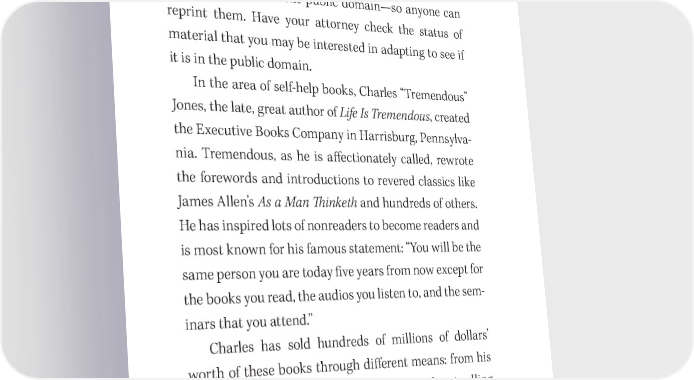 268 How to Fast Write a Book and Make a Fortune death. In the case of “a joint work prepared by two or more authors who did not work for hire,” the term lasts for 70 years after the last surviving author’s death. 吀栀is means that (generally speaking) works published over 100 years ago are in the public domain—so anyone can reprint them. Have your attorney check the status of material that you may be interested in adapting to see if it is in the public domain. In the area of self- help books, Charles “Tremendous” Jones, the late, great author of Life Is Tremendous, created the Executive Books Company in Harrisburg, Pennsylva- nia. Tremendous, as he is a昀昀ectionately called, rewrote the forewords and introductions to revered classics like James Allen’s As a Man 吀栀inketh and hundreds of others. He has inspired lots of nonreaders to become readers and is most known for his famous statement: “You will be the same person you are today 昀椀ve years from now except for the books you read, the audios you listen to, and the sem- inars that you attend.” Charles has sold hundreds of millions of dollars’ worth of these books through di昀昀erent means: from his speaking platforms, in volume to major direct- selling companies like Amway, and book by book to his col- league speakers, friends, and customers.