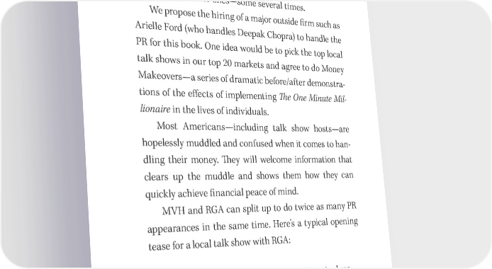 吀栀e One Minute Millionaire: A Marketing Plan 167 10. 吀栀e authors will be available for a major media tour to promote the book. 吀栀e media track record of MVH and RGA is impressive. 吀栀ey have been on virtually every major talk show and thousands of minor ones—some several times. We propose the hiring of a major outside 昀椀rm such as Arielle Ford (who handles Deepak Chopra) to handle the PR for this book. One idea would be to pick the top local talk shows in our top 20 markets and agree to do Money Makeovers—a series of dramatic before/after demonstra- tions of the e昀昀ects of implementing 吀栀e One Minute Mil- lionaire in the lives of individuals. Most Americans—including talk show hosts—are hopelessly muddled and confused when it comes to han- dling their money. 吀栀ey will welcome information that clears up the muddle and shows them how they can quickly achieve 昀椀nancial peace of mind. MVH and RGA can split up to do twice as many PR appearances in the same time. Here’s a typical opening tease for a local talk show with RGA: In the eighties and nineties, he showed America how to make big money in real estate, and there are thou- sands of millionaires nationwide to prove it. Now he’s back with a revolutionary new program he calls the One Minute Millionaire. Our guest is Robert Allen, and when Robert Allen talks, it’s not just talk. He