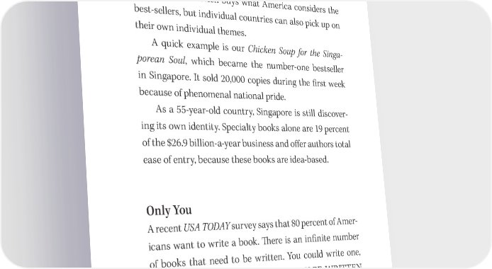 How to Fast Write a Book and Make a Fortune 251 source) called Publishers Weekly, a highly in昀氀uential pub- lication that features all the industry insiders predicting trends and talking about what’s hot and not. 吀栀e world book market is even bigger! 吀栀is market often buys what America considers the best- sellers, but individual countries can also pick up on their own individual themes. A quick example is our Chicken Soup for the Singa- porean Soul, which became the number- one bestseller in Singapore. It sold 20,000 copies during the 昀椀rst week because of phenomenal national pride. As a 55- year- old country, Singapore is still discover- ing its own identity. Specialty books alone are 19 percent of the $26.9 billion- a- year business and o昀昀er authors total ease of entry, because these books are idea- based. Only You A recent USA TODAY survey says that 80 percent of Amer- icans want to write a book. 吀栀ere is an in昀椀nite number of books that need to be written. You could write one, maybe even more! Your book can ONLY BE WRITTEN BY YOU. Writing a book gives you in昀氀uence and mega- credibility, helps expand your reputation, can serve to build your business, and makes a lasting contribution to other people.