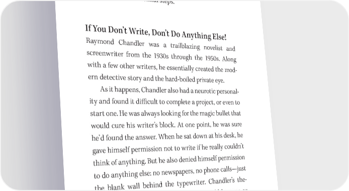 52 You Have a Book in You Sooner or later, your work is going to be critiqued by someone—hopefully by the editor who’s given you a con- tract. It’s in your best interest to have your book in solid shape as soon as possible. Creating a hard copy and read- ing it out loud are essential steps. If You Don’t Write, Don’t Do Anything Else! Raymond Chandler was a trailblazing novelist and screenwriter from the 1930s through the 1950s. Along with a few other writers, he essentially created the mod- ern detective story and the hard- boiled private eye. As it happens, Chandler also had a neurotic personal- ity and found it di昀케cult to complete a project, or even to start one. He was always looking for the magic bullet that would cure his writer’s block. At one point, he was sure he’d found the answer. When he sat down at his desk, he gave himself permission not to write if he really couldn’t think of anything. But he also denied himself permission to do anything else: no newspapers, no phone calls—just the blank wall behind the typewriter. Chandler’s the- ory was that the sensory deprivation would become so unpleasant that he’d eventually start writing in spite of himself. Did it work? Not exactly as he’d hoped, but the prin- ciple is interesting. Some writers are hard- core pro- crastinators. 吀栀ese people really will turn even a slight