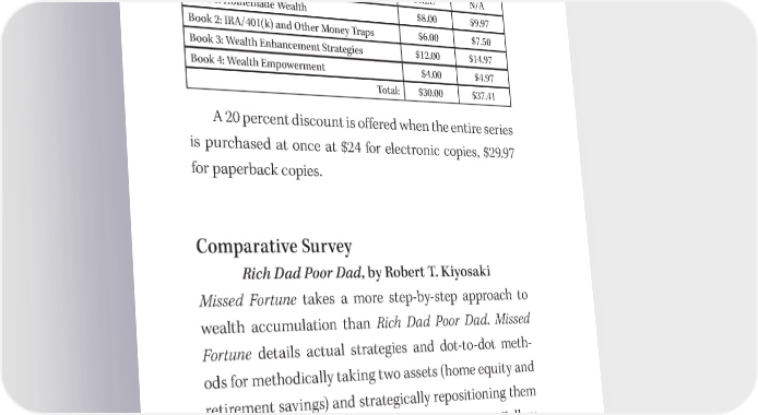 150 You Have a Book in You 2. Separate the book into four smaller books priced as follows: Electronic Paperback Copies Copies Preface, Introduction, Table of Contents FREE N/A Book 1: Homemade Wealth $8.00 $9.97 Book 2: IRA/401(k) and Other Money Traps $6.00 $7.50 Book 3: Wealth Enhancement Strategies $12.00 $14.97 Book 4: Wealth Empowerment $4.00 $4.97 Total: $30.00 $37.41 A 20 percent discount is o昀昀ered when the entire series is purchased at once at $24 for electronic copies, $29.97 for paperback copies. Comparative Survey Rich Dad Poor Dad, by Robert T. Kiyosaki Missed Fortune takes a more step- by- step approach to wealth accumulation than Rich Dad Poor Dad. Missed Fortune details actual strategies and dot- to- dot meth- ods for methodically taking two assets (home equity and retirement savings) and strategically repositioning them to dramatically enhance net worth over time. College 昀椀nance professors who have been recommending Rich Dad Poor Dad as supplemental reading material have been asking for books with more meat on exactly how to enhance net worth rather than books simply about money. Missed Fortune satis昀椀es that appetite.