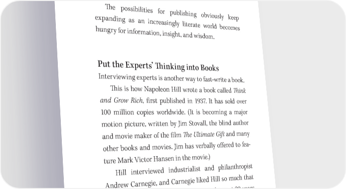 How to Fast Write a Book and Make a Fortune 265 99 percent accuracy after training. Or you could use www .idictate.com (very inexpensive), and send your dictated files from your computer to theirs in India. Or call your dictation in daily by phone over Skype.com for free. 吀栀e possibilities for publishing obviously keep expanding as an increasingly literate world becomes hungry for information, insight, and wisdom. Put the Experts’ 吀栀inking into Books Interviewing experts is another way to fast- write a book. 吀栀is is how Napoleon Hill wrote a book called 吀栀ink and Grow Rich, 昀椀rst published in 1937. It has sold over 100 million copies worldwide. (It is becoming a major motion picture, written by Jim Stovall, the blind author and movie maker of the 昀椀lm 吀栀e Ultimate Gift and many other books and movies. Jim has verbally o昀昀ered to fea- ture Mark Victor Hansen in the movie.) Hill interviewed industrialist and philanthropist Andrew Carnegie, and Carnegie liked Hill so much that he tested him. He asked him to invest the next 20 years interviewing the world’s 500 best leaders, politicians, and businesspeople. From these he would put together the principles and philosophy of personal success and achievement, and do it as a self- funded author in order to prove that the principles work.