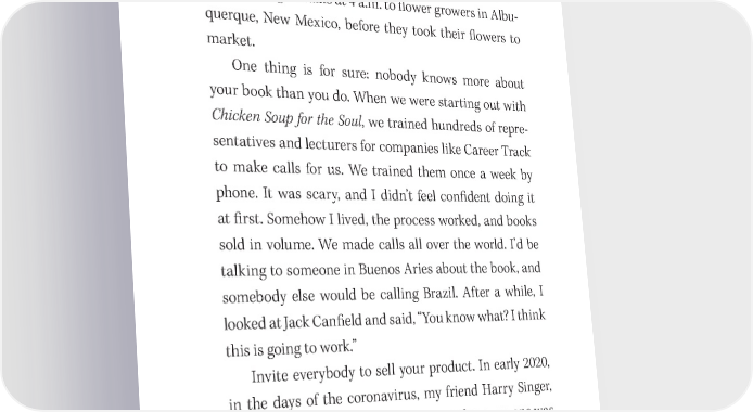 Marketing Your Best Seller 75 memorable to me was the Rose Bud Catalogue. We were featured on the cover of the December issue (the best time to sell gift books like ours), surrounded by 昀氀owers, and it turned on an entire industry for us. For example, I was paid to give talks at 4 a.m. to 昀氀ower growers in Albu- querque, New Mexico, before they took their 昀氀owers to market. One thing is for sure: nobody knows more about your book than you do. When we were starting out with Chicken Soup for the Soul, we trained hundreds of repre- sentatives and lecturers for companies like Career Track to make calls for us. We trained them once a week by phone. It was scary, and I didn’t feel con昀椀dent doing it at 昀椀rst. Somehow I lived, the process worked, and books sold in volume. We made calls all over the world. I’d be talking to someone in Buenos Aries about the book, and somebody else would be calling Brazil. After a while, I looked at Jack Can昀椀eld and said, “You know what? I think this is going to work.” Invite everybody to sell your product. In early 2020, in the days of the coronavirus, my friend Harry Singer, owner of Ultra Soap products, told me that everyone was out of antiviral and antibacterial soap; 70 percent alcohol was also in short supply. Harry created a Survival antivi- ral and antibacterial soap box that started selling briskly on Amazon. Suddenly he was getting calls from hospitals