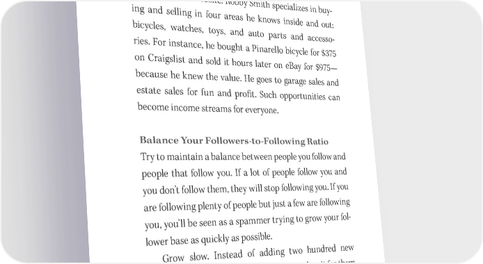 The Power of Social Networking . . . 223 $1,000 or $2,000 every day buying locally and selling globally. He’s putting into action the ideas that my friend Robby Smith revealed in his book called Buy on Craigslist and Sell on eBay. 吀栀e book is available exclusively through Dean Graziosi’s website. Robby Smith specializes in buy- ing and selling in four areas he knows inside and out: bicycles, watches, toys, and auto parts and accesso- ries. For instance, he bought a Pinarello bicycle for $375 on Craigslist and sold it hours later on eBay for $975— because he knew the value. He goes to garage sales and estate sales for fun and pro昀椀t. Such opportunities can become income streams for everyone. Balance Your Followers- to- Following Ratio Try to maintain a balance between people you follow and people that follow you. If a lot of people follow you and you don’t follow them, they will stop following you. If you are following plenty of people but just a few are following you, you’ll be seen as a spammer trying to grow your fol- lower base as quickly as possible. Grow slow. Instead of adding two hundred new friends all of a sudden, add maybe 昀椀fty and wait for them to follow you back. 吀栀en follow another 昀椀fty. Use tools like Friend or Follow (friendorfollow.com). 吀栀is is the best way to balance your ratio of followers to people you are following, and it takes just a few minutes.