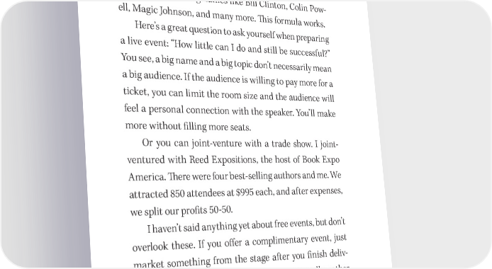 124 You Have a Book in You a database of 10,000 people, market your event to them, and you have your audience. 吀栀ey get to see their favorite speaker—and they also get to meet you. Peter Lowe built his giant seminar business by hiring Zig Ziglar. Lowe went on to invite big names like Bill Clinton, Colin Pow- ell, Magic Johnson, and many more. 吀栀is formula works. Here’s a great question to ask yourself when preparing a live event: “How little can I do and still be successful?” You see, a big name and a big topic don’t necessarily mean a big audience. If the audience is willing to pay more for a ticket, you can limit the room size and the audience will feel a personal connection with the speaker. You’ll make more without 昀椀lling more seats. Or you can joint- venture with a trade show. I joint- ventured with Reed Expositions, the host of Book Expo America. 吀栀ere were four best- selling authors and me. We attracted 850 attendees at $995 each, and after expenses, we split our pro昀椀ts 50- 50. I haven’t said anything yet about free events, but don’t overlook these. If you o昀昀er a complimentary event, just market something from the stage after you 昀椀nish deliv- ering tons of value to the audience. You can sell another well- priced event, a workshop, your book, a webinar, a telecourse, or anything else you can create. Alex Mandossian, a very successful and well- respected Internet marketer who will soon be the 昀椀rst stay- at- home billionaire, likes to say, “Your book is actu-