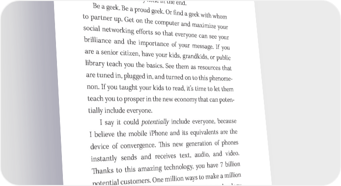188 You Have a Book in You 吀栀e biggest mistake you can make is to say that you just want to be the writer and let everyone else do all that other stu昀昀. If you do that, you will be sharing your pie with a bunch of people who all want large slices and who will leave you with very little in the end. Be a geek. Be a proud geek. Or 昀椀nd a geek with whom to partner up. Get on the computer and maximize your social networking e昀昀orts so that everyone can see your brilliance and the importance of your message. If you are a senior citizen, have your kids, grandkids, or public library teach you the basics. See them as resources that are tuned in, plugged in, and turned on to this phenome- non. If you taught your kids to read, it’s time to let them teach you to prosper in the new economy that can poten- tially include everyone. I say it could potentially include everyone, because I believe the mobile iPhone and its equivalents are the device of convergence. 吀栀is new generation of phones instantly sends and receives text, audio, and video. 吀栀anks to this amazing technology, you have 7 billion potential customers. One million ways to make a million bucks will be next in the evolution of this technology. Toward this end, thousands of applications for the iPhone and its cousins are coming into being. One such applica- tion was created by Joel Comm, my friend, colleague, and teacher at our Mega Marketing Seminars. Joel conceived