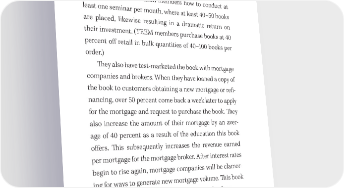 142 You Have a Book in You of the book to help them get started. In various market tests, they have found that for every 40 books placed in the hands of their clients and prospects, a minimum of $100,000 of new revenue is generated within the following 90 days. 吀栀ey show TEEM members how to conduct at least one seminar per month, where at least 40–50 books are placed, likewise resulting in a dramatic return on their investment. (TEEM members purchase books at 40 percent o昀昀 retail in bulk quantities of 40–100 books per order.) 吀栀ey also have test- marketed the book with mortgage companies and brokers. When they have loaned a copy of the book to customers obtaining a new mortgage or re昀椀- nancing, over 50 percent come back a week later to apply for the mortgage and request to purchase the book. 吀栀ey also increase the amount of their mortgage by an aver- age of 40 percent as a result of the education this book o昀昀ers. 吀栀is subsequently increases the revenue earned per mortgage for the mortgage broker. After interest rates begin to rise again, mortgage companies will be clamor- ing for ways to generate new mortgage volume. 吀栀is book provides an incredible and proven solution for them. 吀栀ird Test Edition in Demand A third revised test edition, with about 500 minor improvements, was published in April, and 1,000 books were sold within 60 days by word of mouth only.