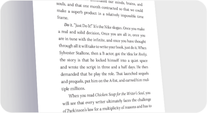 Marketing Your Best Seller 137 dom, and insights and collated them into a semblance of exciting readability, and Jack did a quick edit. We accomplished a miracle. 吀栀e book was 吀栀e Alad- din Factor and sold 3.6 million copies. Parkinson’s law dominated our minds, brains, and souls, and that one month contracted so that we could make a superb product in a relatively impossible time frame. Do it. “Just Do It!” It’s the Nike slogan. Once you make a real and solid decision, Once you are all in, once you are in tune with the in昀椀nite, and once you have thought through all it will take to write your book, just do it. When Sylvester Stallone, then a B actor, got the idea for Rocky, the story is that he locked himself into a quiet space and wrote the script in three and a half days. He then demanded that he play the role. 吀栀at launched sequels and prequels, put him on the A- list, and earned him mul- tiple millions. When you read Chicken Soup for the Writer’s Soul, you will see that every writer ultimately faces the challenge of Parkinson’s law for a multiplicity of reasons and has to just DO IT!
