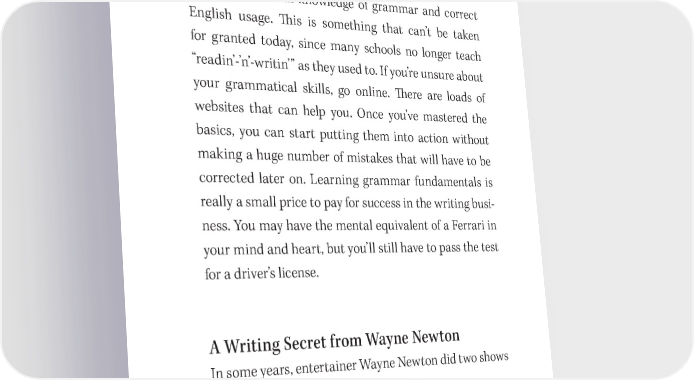 Write a GREAT Book! 37 昀椀x it later. 吀栀e industrialist, writer, and philanthropist Peter J. Daniels, author of How to Be Happy though Rich told me: “You can 昀椀x something; you can’t 昀椀x nothing.” 吀栀ere is one caveat to this principle. You must have at least a minimal knowledge of grammar and correct English usage. 吀栀is is something that can’t be taken for granted today, since many schools no longer teach “readin’- ’n’- writin’” as they used to. If you’re unsure about your grammatical skills, go online. 吀栀ere are loads of websites that can help you. Once you’ve mastered the basics, you can start putting them into action without making a huge number of mistakes that will have to be corrected later on. Learning grammar fundamentals is really a small price to pay for success in the writing busi- ness. You may have the mental equivalent of a Ferrari in your mind and heart, but you’ll still have to pass the test for a driver’s license. A Writing Secret from Wayne Newton In some years, entertainer Wayne Newton did two shows a night, 365 nights a year, in Las Vegas. When you’re onstage that much, lots of challenges arise. Just the physical strength that’s required is amaz- ing! But the biggest challenge, as he explained in a 60 Minutes interview, was 昀椀nding a way to make every show seem special. You’ve got an audience of people who