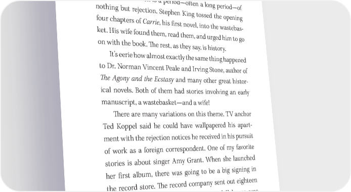 Marketing Your Best Seller 87 Reject Rejection How can you tell if you’re going to make it in the book business? One thing virtually all successful writers seem to have in common is a period—often a long period—of nothing but rejection. Stephen King tossed the opening four chapters of Carrie, his 昀椀rst novel, into the wastebas- ket. His wife found them, read them, and urged him to go on with the book. 吀栀e rest, as they say, is history. It’s eerie how almost exactly the same thing happened to Dr. Norman Vincent Peale and Irving Stone, author of 吀栀e Agony and the Ecstasy and many other great histor- ical novels. Both of them had stories involving an early manuscript, a wastebasket—and a wife! 吀栀ere are many variations on this theme. TV anchor Ted Koppel said he could have wallpapered his apart- ment with the rejection notices he received in his pursuit of work as a foreign correspondent. One of my favorite stories is about singer Amy Grant. When she launched her 昀椀rst album, there was going to be a big signing in the record store. 吀栀e record company sent out eighteen hundred hand- engraved invitations. A full house was expected. Not one person showed up. She sang for ninety minutes to the store manager. As Jack and were repeatedly getting rejected, we kept saying, “Next!” If you say, “Next!” long enough, someone will eventually and inevitably say yes. Remember, Jack