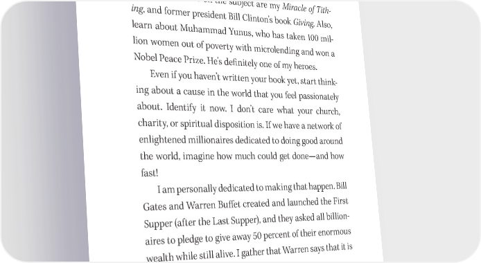 Marketing Your Best Seller 101 erty to help spur entrepreneurship. It works worldwide. You don’t have to know how to end world hunger. You can 昀椀gure out how to get one goat, or one dollar, to someone who needs it, and the di昀昀erence begins there. Two resources on the subject are my Miracle of Tith- ing, and former president Bill Clinton’s book Giving. Also, learn about Muhammad Yunus, who has taken 100 mil- lion women out of poverty with microlending and won a Nobel Peace Prize. He’s de昀椀nitely one of my heroes. Even if you haven’t written your book yet, start think- ing about a cause in the world that you feel passionately about. Identify it now. I don’t care what your church, charity, or spiritual disposition is. If we have a network of enlightened millionaires dedicated to doing good around the world, imagine how much could get done—and how fast! I am personally dedicated to making that happen. Bill Gates and Warren Bu昀昀et created and launched the First Supper (after the Last Supper), and they asked all billion- aires to pledge to give away 50 percent of their enormous wealth while still alive. I gather that Warren says that it is working much better than expected. I hope you will be inspired by my words, actions, and thinking to be a lifelong contributor. Helen Keller said, “Alone we can do so little; together we can do so much.” If all writers started giving a percentage of their prof- its to worthy causes, readership would boom and bloom,