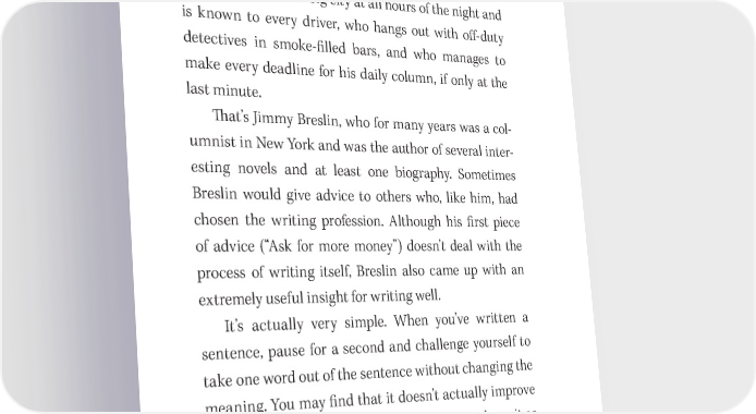 42 You Have a Book in You A Writing Secret from Jimmy Breslin 吀栀e late Jimmy Breslin may have been the last of what were once called newspapermen. 吀栀at is, someone who takes taxis around a big city at all hours of the night and is known to every driver, who hangs out with o昀昀- duty detectives in smoke- 昀椀lled bars, and who manages to make every deadline for his daily column, if only at the last minute. 吀栀at’s Jimmy Breslin, who for many years was a col- umnist in New York and was the author of several inter- esting novels and at least one biography. Sometimes Breslin would give advice to others who, like him, had chosen the writing profession. Although his 昀椀rst piece of advice (“Ask for more money”) doesn’t deal with the process of writing itself, Breslin also came up with an extremely useful insight for writing well. It’s actually very simple. When you’ve written a sentence, pause for a second and challenge yourself to take one word out of the sentence without changing the meaning. You may 昀椀nd that it doesn’t actually improve when you do this, in which case you can just leave it as it was. But almost always the sentence will improve— and the time it takes to do the “extraction” will translate into time saved later on, when your book is in the edit- ing process.