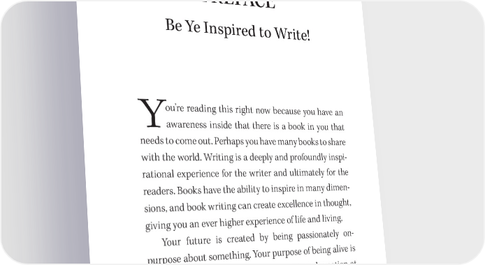 PREFACE Be Ye Inspired to Write! ou’re reading this right now because you have an Yawareness inside that there is a book in you that needs to come out. Perhaps you have many books to share with the world. Writing is a deeply and profoundly inspi- rational experience for the writer and ultimately for the readers. Books have the ability to inspire in many dimen- sions, and book writing can create excellence in thought, giving you an ever higher experience of life and living. Your future is created by being passionately on- purpose about something. Your purpose of being alive is to create and contribute. Writing is inspired creation at its best, and when done in the spirit of excellence, leaves a great and lasting contribution. Within you now is the ability to write things you never dreamed possible and to serve greatly with love. Writing your book will be an unforgettable learning experience.