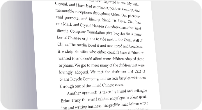 Write a GREAT Book! 35 over 昀椀fteen readers per book. Jack brought back a giant three- ring binder of press clippings about his monumen- tally heroic reception in India. It was a wow to behold. In China, I have been told, each of our books is read by twelve readers, it has been reported to me. My wife, Crystal, and I have had enormous, positive, exciting, and memorable receptions throughout China. Our phenom- enal promoter and lifelong friend, Dr. David Chu, had our Mark and Crystal Hansen Foundation and the Giant Bicycle Company Foundation give bicycles for a num- ber of Chinese orphans to ride next to the Great Wall of China. 吀栀e media loved it and monitored and broadcast it widely. Families who either couldn’t have children or wanted to and could a昀昀ord more children adopted these orphans. We got to meet many of the children that were lovingly adopted. We met the chairman and CEO of Giant Bicycle Company, and we rode bicycles with them through one of the famed Chinese cities. Another approach is taken by friend and colleague Brian Tracy, the man I call the encyclopedia of our speak- ing and writing business. 吀栀e proli昀椀c Isaac Asimov wrote over 昀椀ve hundred books and an estimated 90,000 letters and postcards. I expect my friend will eclipse his giant body of work. As an adult Brian has mastered German and Spanish and created programs in these languages as well. Brian reads 昀椀fty great books on a subject of interest, makes