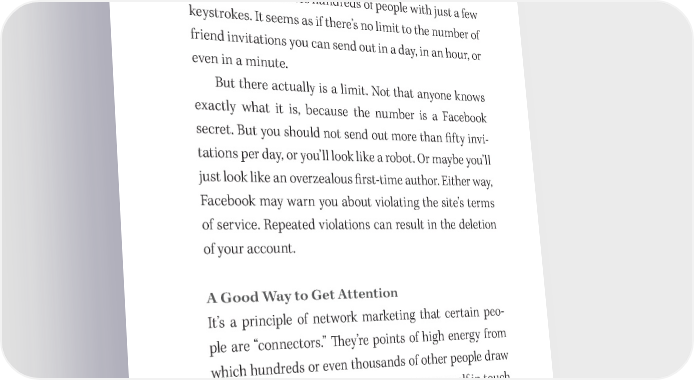 The Power of Social Networking . . . 211 Restrict How Many Friends You Add per Day Sometimes writers are so excited about social network marketing that they can’t believe their eyes. Just think of it: instead of being holed up in a garret scribbling away, a writer can now access hundreds of people with just a few keystrokes. It seems as if there’s no limit to the number of friend invitations you can send out in a day, in an hour, or even in a minute. But there actually is a limit. Not that anyone knows exactly what it is, because the number is a Facebook secret. But you should not send out more than 昀椀fty invi- tations per day, or you’ll look like a robot. Or maybe you’ll just look like an overzealous 昀椀rst- time author. Either way, Facebook may warn you about violating the site’s terms of service. Repeated violations can result in the deletion of your account. A Good Way to Get Attention It’s a principle of network marketing that certain peo- ple are “connectors.” 吀栀ey’re points of high energy from which hundreds or even thousands of other people draw inspiration and information. By putting yourself in touch with those people, you can make yourself visible to every- one who shares your interest. 吀栀is won’t happen by itself. Bob Dylan and Sheryl Crow do have Facebook pages—but who’s really behind those pages is another question. Connecting with the