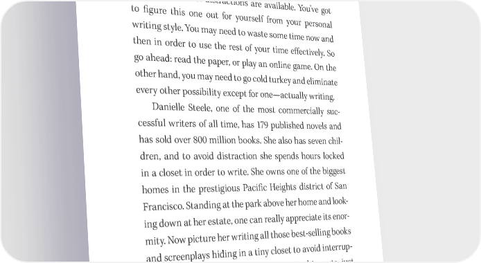 Write a GREAT Book! 53 distraction into a daylong avoidance mechanism. If that’s your situation, you really should eliminate every possible time waster in order to get something done. Other writers are actually more productive when a certain number of distractions are available. You’ve got to 昀椀gure this one out for yourself from your personal writing style. You may need to waste some time now and then in order to use the rest of your time e昀昀ectively. So go ahead: read the paper, or play an online game. On the other hand, you may need to go cold turkey and eliminate every other possibility except for one—actually writing. Danielle Steele, one of the most commercially suc- cessful writers of all time, has 179 published novels and has sold over 800 million books. She also has seven chil- dren, and to avoid distraction she spends hours locked in a closet in order to write. She owns one of the biggest homes in the prestigious Paci昀椀c Heights district of San Francisco. Standing at the park above her home and look- ing down at her estate, one can really appreciate its enor- mity. Now picture her writing all those best- selling books and screenplays hiding in a tiny closet to avoid interrup- tions and distractions. If you have to go this route, just make sure there’s an adequate air supply! Note: there are in昀椀nite systems, ways, and processes to make your book happen. I am showing you a smorgas- bord of models to help you feel comfortable with one that can make you insanely successful.