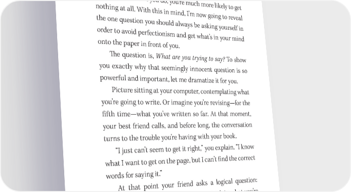Write a GREAT Book! 27 vously wrote and carefully stored in a transparent plastic binder. Your book has to be perfect, doesn’t it? No, it doesn’t. In fact, you shouldn’t even try for per- fection—because if you do, you’re much more likely to get nothing at all. With this in mind, I’m now going to reveal the one question you should always be asking yourself in order to avoid perfectionism and get what’s in your mind onto the paper in front of you. 吀栀e question is, What are you trying to say? To show you exactly why that seemingly innocent question is so powerful and important, let me dramatize it for you. Picture sitting at your computer, contemplating what you’re going to write. Or imagine you’re revising—for the 昀椀fth time—what you’ve written so far. At that moment, your best friend calls, and before long, the conversation turns to the trouble you’re having with your book. “I just can’t seem to get it right,” you explain. “I know what I want to get on the page, but I can’t 昀椀nd the correct words for saying it.” At that point your friend asks a logical question: “What are you trying to say?” So you explain what you’re trying to say—and then, when the phone conversation is over, you’re back to trying to say it. But what if, when your friend asked, “What are you trying to say?” you had just gone ahead and written down your answer? What if you just stopped trying and started