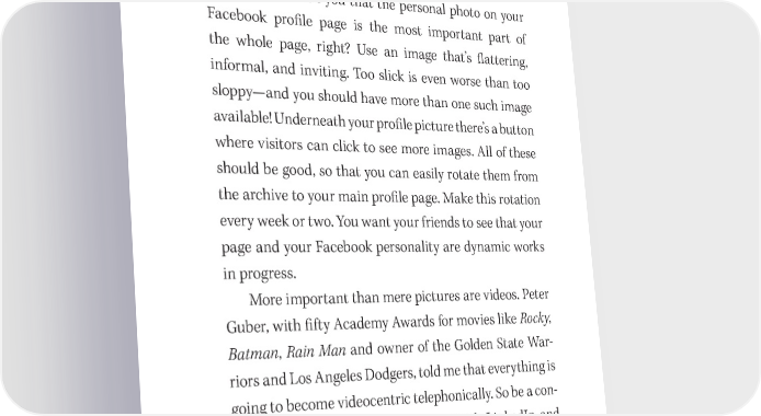 The Power of Social Networking . . . 205 you don’t really have a choice. And even within those con- straints, there’s plenty of space for creativity. A Picture Is Worth 1,000 Words I don’t need to tell you that the personal photo on your Facebook pro昀椀le page is the most important part of the whole page, right? Use an image that’s 昀氀attering, informal, and inviting. Too slick is even worse than too sloppy—and you should have more than one such image available! Underneath your pro昀椀le picture there’s a button where visitors can click to see more images. All of these should be good, so that you can easily rotate them from the archive to your main pro昀椀le page. Make this rotation every week or two. You want your friends to see that your page and your Facebook personality are dynamic works in progress. More important than mere pictures are videos. Peter Guber, with 昀椀fty Academy Awards for movies like Rocky, Batman, Rain Man and owner of the Golden State War- riors and Los Angeles Dodgers, told me that everything is going to become videocentric telephonically. So be a con- scious video creator. Look at my Facebook, LinkedIn, and other sites for ideas. Also, please note that with the advance of 5G we will soon have three- dimensional avatars being emitted out of our phones by the end of 2020, according to Verizon CEO Hans Vestberg. You will be in one place, broadcast-