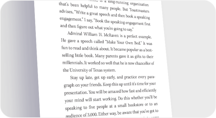 Marketing Your Best Seller 117 Speak! Every author has to learn how to speak and do to it well. My approach to speaking is unique. Toastmasters Inter- national, for instance, is a long- running organization that’s been helpful to many people. But Toastmasters advises, “Write a great speech and then book a speaking engagement.” I say, “Book the speaking engagement 昀椀rst and then 昀椀gure out what you’re going to say.” Admiral William H. McRaven is a perfect example. He gave a speech called “Make Your Own Bed.” It was fun to read and think about. It became popular as a best- selling little book. Many parents gave it as gifts to their millennials. It worked so well that he is now chancellor of the University of Texas system. Stay up late, get up early, and practice every para- graph on your friends. Keep this up until it’s time for your presentation. You will be amazed how fast and e昀케ciently your mind will start working. Do this whether you’ll be speaking to 昀椀ve people at a small bookstore or to an audience of 3,000. Either way, be aware that you’ve got to show up and deliver a talk. For me, the secret is to come up with three key points and then link them together to deliver a grand slam home run. Please check my website for my audio products on mastering the 昀椀ne art of speak- ing and prospering on the platform.