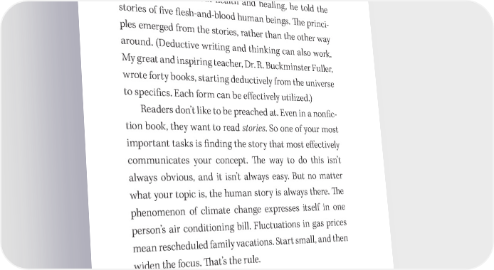 40 You Have a Book in You 吀栀e secret was to always go from a speci昀椀c incident to a general principle—the inductive method. Crichton started putting this approach to work in one of his 昀椀rst books, entitled Five Patients. Instead of making grand pronouncements about health and healing, he told the stories of 昀椀ve 昀氀esh- and- blood human beings. 吀栀e princi- ples emerged from the stories, rather than the other way around. (Deductive writing and thinking can also work. My great and inspiring teacher, Dr. R. Buckminster Fuller, wrote forty books, starting deductively from the universe to speci昀椀cs. Each form can be e昀昀ectively utilized.) Readers don’t like to be preached at. Even in a non昀椀c- tion book, they want to read stories. So one of your most important tasks is 昀椀nding the story that most e昀昀ectively communicates your concept. 吀栀e way to do this isn’t always obvious, and it isn’t always easy. But no matter what your topic is, the human story is always there. 吀栀e phenomenon of climate change expresses itself in one person’s air conditioning bill. Fluctuations in gas prices mean rescheduled family vacations. Start small, and then widen the focus. 吀栀at’s the rule. A Writing Secret from Mario Puzo If you don’t want your book to sleep with the 昀椀shes, the author of 吀栀e Godfather had some good advice. Mario