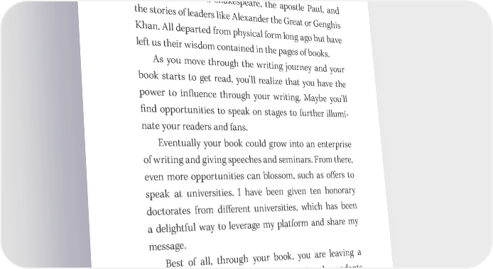 Preface 3 so remember to keep talking to them and also to keep a database. I am forever reading the brilliance of the ages, writ- ten hundreds and thousands of years ago—the works of Plato, Mark Twain, Shakespeare, the apostle Paul, and the stories of leaders like Alexander the Great or Genghis Khan. All departed from physical form long ago but have left us their wisdom contained in the pages of books. As you move through the writing journey and your book starts to get read, you’ll realize that you have the power to in昀氀uence through your writing. Maybe you’ll 昀椀nd opportunities to speak on stages to further illumi- nate your readers and fans. Eventually your book could grow into an enterprise of writing and giving speeches and seminars. From there, even more opportunities can blossom, such as o昀昀ers to speak at universities. I have been given ten honorary doctorates from di昀昀erent universities, which has been a delightful way to leverage my platform and share my message. Best of all, through your book, you are leaving a printed legacy that will last for all time. Your descendants into many generations will revel in reading their ances- tor’s work. 吀栀at’s an inspirational legacy worth leaving. Writing o昀昀ers more opportunity now than ever in history. Of the 7.8 billion people living on planet earth, approximately 4 billion are literate. My goal is to get every-