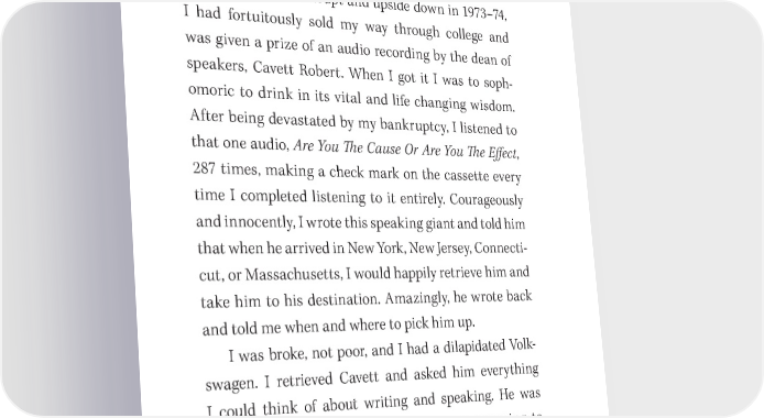 122 You Have a Book in You re昀氀ected glory. 吀栀eir gift is living on in you. Do not be shy about initiating a mentor relationship if you feel called to do so. Be humble and helpful, and ask 昀椀rst what you can do to serve. You will be grateful you did. When I was bankrupt and upside down in 1973–74, I had fortuitously sold my way through college and was given a prize of an audio recording by the dean of speakers, Cavett Robert. When I got it I was to soph- omoric to drink in its vital and life changing wisdom. After being devastated by my bankruptcy, I listened to that one audio, Are You 吀栀e Cause Or Are You 吀栀e E昀昀ect, 287 times, making a check mark on the cassette every time I completed listening to it entirely. Courageously and innocently, I wrote this speaking giant and told him that when he arrived in New York, New Jersey, Connecti- cut, or Massachusetts, I would happily retrieve him and take him to his destination. Amazingly, he wrote back and told me when and where to pick him up. I was broke, not poor, and I had a dilapidated Volk- swagen. I retrieved Cavett and asked him everything I could think of about writing and speaking. He was beyond kind, gracious, insightful, and encouraging to me. I learned the profession of speaking and selling suc- cessfully from the platform thanks exclusively to Cavett, who also mentored Zig Ziglar and thousands of profes- sional speakers.