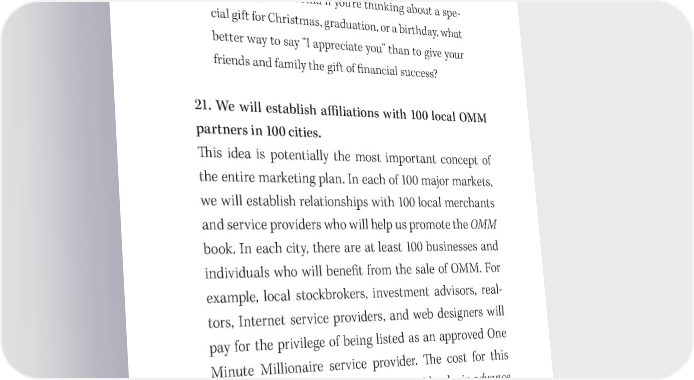 吀栀e One Minute Millionaire: A Marketing Plan 173 friend. In fact, we’ve made it easy for you. In the back of the book is a coupon for 10 percent o昀昀 the price of this book. We simply ask that you pass that coupon on to one of your friends. After all, friends don’t let friends pay retail. And if you’re thinking about a spe- cial gift for Christmas, graduation, or a birthday, what better way to say “I appreciate you” than to give your friends and family the gift of 昀椀nancial success? 21. We will establish a昀케liations with 100 local OMM partners in 100 cities. 吀栀is idea is potentially the most important concept of the entire marketing plan. In each of 100 major markets, we will establish relationships with 100 local merchants and service providers who will help us promote the OMM book. In each city, there are at least 100 businesses and individuals who will bene昀椀t from the sale of OMM. For example, local stockbrokers, investment advisors, real- tors, Internet service providers, and web designers will pay for the privilege of being listed as an approved One Minute Millionaire service provider. 吀栀e cost for this relationship is the agreement to buy 100 books in advance of the publication date. 吀栀en these merchants will agree to o昀昀er the book to their top clients and customers as a gift. During the PR tour, MVH and RGA will hold private seminars with these 100 local sponsors and a few of their top clients.