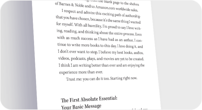 Write a GREAT Book! 21 certain: the information contained in these pages is the best resource anywhere for building your career as a writer. As a writer myself, I’ve wanted to publish this book for a long time. It contains everything I’ve learned about all aspects of writing, from the blank page to the shelves of Barnes & Noble and to Amazon.com worldwide sales. I respect and admire this exciting path of authorship that you have chosen, because it’s the same thing I wanted for myself. With all humility, I’m proud to say I love writ- ing, reading, and thinking about the entire process. Even with as much success as I have had as an author, I con- tinue to write more books to this day. I love doing it, and I don’t ever want to stop. I believe my best books, audios, videos, podcasts, plays, and movies are yet to be created. I think I am writing better than ever and am enjoying the experience more than ever. Trust me: you can do it too. Starting right now. 吀栀e First Absolute Essential: Your Basic Message What are the absolute essentials for a powerful and suc- cessful non昀椀ction book? As it happens, there are four of them. If you learn nothing else from this book, I urge you to take these four absolute essentials to heart. First, your book must have an interesting and import- ant message to convey. At 昀椀rst, this might seem obvious,