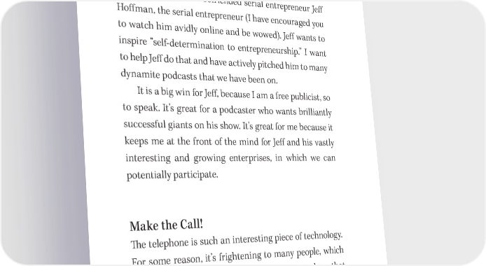 134 You Have a Book in You which millions of dollars were on the table. He took his writers and their work seriously, and so should you. Another way to enroll a pitch partner is pitch to some- one important and advance their businesses or protocols. Recently we met and befriended serial entrepreneur Je昀昀 Ho昀昀man, the serial entrepreneur (I have encouraged you to watch him avidly online and be wowed). Je昀昀 wants to inspire “self- determination to entrepreneurship.” I want to help Je昀昀 do that and have actively pitched him to many dynamite podcasts that we have been on. It is a big win for Je昀昀, because I am a free publicist, so to speak. It’s great for a podcaster who wants brilliantly successful giants on his show. It’s great for me because it keeps me at the front of the mind for Je昀昀 and his vastly interesting and growing enterprises, in which we can potentially participate. Make the Call! 吀栀e telephone is such an interesting piece of technology. For some reason, it’s frightening to many people, which leads to some very negative e昀昀ects. Surveys show that more business is lost because of a client’s negative experi- ence on the telephone than for any other reason. Everyone has a love- hate relationship with the phone, yet there are more people talking on the phone than ever before in history. A lot more. It’s estimated that 8 billion