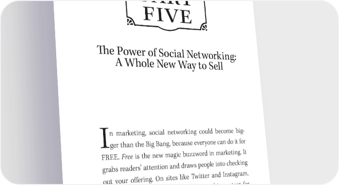 A1!1B PART FIVE C4$4D 吀栀e Power of Social Networking: A Whole New Way to Sell n marketing, social networking could become big- Iger than the Big Bang, because everyone can do it for FREE. Free is the new magic buzzword in marketing. It grabs readers’ attention and draws people into checking out your o昀昀ering. On sites like Twitter and Instagram, you can post virtually all nonpornographic content for free. 吀栀is levels the playing 昀椀eld. Beginners with imagi- nation, creativity, and originality have as much chance of hitting a grand slam business homerun as a Fortune 500 company. Ideas win in social networking. Anyone, including you, can have the next big idea.