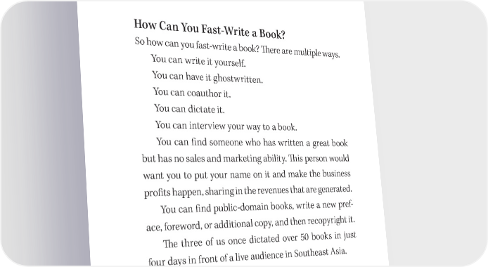 How to Fast Write a Book and Make a Fortune 255 time it was told, so Jack got the idea to do Chicken Soup for the Soul. I asked if we could write it together. 吀栀e rest is best- selling history. How Can You Fast- Write a Book? So how can you fast- write a book? 吀栀ere are multiple ways. You can write it yourself. You can have it ghostwritten. You can coauthor it. You can dictate it. You can interview your way to a book. You can 昀椀nd someone who has written a great book but has no sales and marketing ability. 吀栀is person would want you to put your name on it and make the business pro昀椀ts happen, sharing in the revenues that are generated. You can 昀椀nd public- domain books, write a new pref- ace, foreword, or additional copy, and then recopyright it. 吀栀e three of us once dictated over 50 books in just four days in front of a live audience in Southeast Asia. Get the Brain Storming! Before you write a book, have a soul- storming session with yourself, friends, or Mastermind group, and write out as many titles as you can.