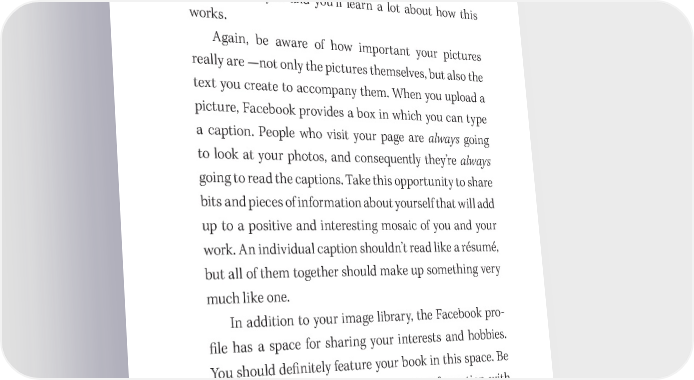The Power of Social Networking . . . 207 of people. But that purpose is best served when you’re conversational, informal, and energetic—without being overwhelming. 吀栀ere are dozens of opportunities for this on your Facebook pro昀椀le. Explore the pro昀椀les of people who interest you and you’ll learn a lot about how this works. Again, be aware of how important your pictures really are —not only the pictures themselves, but also the text you create to accompany them. When you upload a picture, Facebook provides a box in which you can type a caption. People who visit your page are always going to look at your photos, and consequently they’re always going to read the captions. Take this opportunity to share bits and pieces of information about yourself that will add up to a positive and interesting mosaic of you and your work. An individual caption shouldn’t read like a résumé, but all of them together should make up something very much like one. In addition to your image library, the Facebook pro- 昀椀le has a space for sharing your interests and hobbies. You should de昀椀nitely feature your book in this space. Be sure to mention the title! Embed this information with references to other interests and hobbies your readers are likely to share. For example, if you’ve written a book about rock climbing, there’s a good chance your readers will also connect with wilderness preservation and out- door life in general. Make it clear that you share those