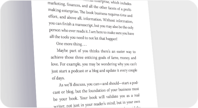 12 Introduction Sigmund Freud said that people write books for three reasons: fame, love, and money. So let’s make it happen! But 昀椀rst let me repeat: you’re not just writing a book. You’re starting a commercial enterprise, which includes marketing, 昀椀nances, and all the other facets of a pro昀椀t- making enterprise. 吀栀e book business requires time and e昀昀ort, and above all, information. Without information, you can 昀椀nish a manuscript, but you may also be the only person who ever reads it. I am here to make sure you have all the tools you need to not let that happen! One more thing . . . Maybe part of you thinks there’s an easier way to achieve those three enticing goals of fame, money, and love. For example, you may be wondering why you can’t just start a podcast or a blog and update it every couple of days. As we’ll discuss, you can—and should—start a pod- cast or blog, but the foundation of your business must be your book. Your book will validate you as a real writer, not just in your reader’s mind, but in your own mind too. A book shows you’re serious. You’ve paid the price and jumped through all the hoops required to get it out into the world. Everyone can respect, admire, and appreciate that. Plus, once your book is in the world, there’s no limit to where it can go or the in昀氀uence it can have. Nothing
