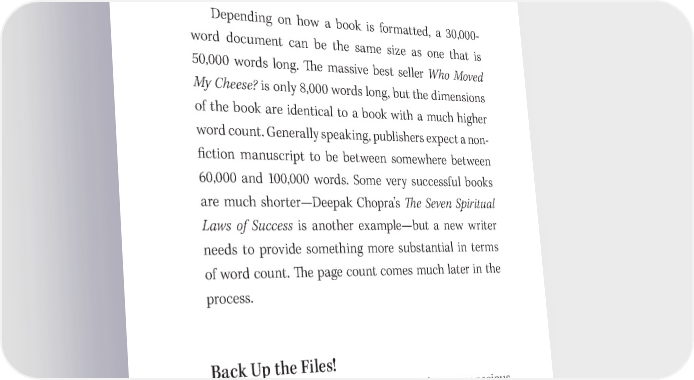 Write a GREAT Book! 61 Many new writers don’t know how many words will be in their book. 吀栀ey think in terms of pages. 吀栀ey say, “Oh, my book is about two hundred pages long.” If you say something like that, you immediately tag yourself as an amateur. Depending on how a book is formatted, a 30,000- word document can be the same size as one that is 50,000 words long. 吀栀e massive best seller Who Moved My Cheese? is only 8,000 words long, but the dimensions of the book are identical to a book with a much higher word count. Generally speaking, publishers expect a non- 昀椀ction manuscript to be between somewhere between 60,000 and 100,000 words. Some very successful books are much shorter—Deepak Chopra’s 吀栀e Seven Spiritual Laws of Success is another example—but a new writer needs to provide something more substantial in terms of word count. 吀栀e page count comes much later in the process. Back Up the Files! Writing a book is both a conscious and an unconscious process. Simply put, there’s a lot of spooky stu昀昀 going on. If you’re really putting your heart onto the page as you should, there will be a certain amount of inner resis- tance to the process. 吀栀at resistance can surface in lots of unexpected ways. Plus, lots of other unexpected things