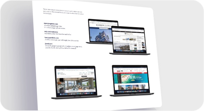 These sites target international luxury buyers online and are exclusive to Macdonald Realty amongst a select few Canadian brokerages. mansionglobal.com 15 million annual page views 2.5 million unique a昀툀uent visitors wsj.com/realestate Searchable at the Wall Street Journal Online luxuryportfolio.com 3 million visitors per year with tra昀케c from 200 countries juwai.com China’s #1 property portal with 1.9 million annual page views, consider this the MLS of China behind the Firewall! realtor.ca ® MLS exposure & the #1 search site in Canada rew.ca A top site in the lower mainland with 1 million views per month leadingrw.com A leading international real estate website with visitors from 200 countries macrealty.com Company website for B.C.’s largest integrated real estate 昀椀rm