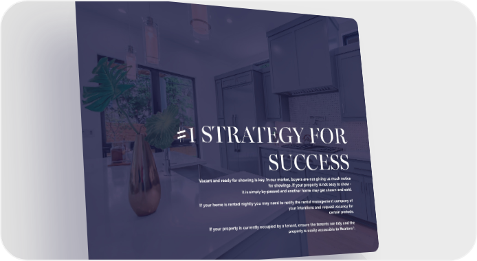 #1 STRATEGY FOR SUCCESS Vacant and ready for showing is key. In our market, buyers are not giving us much notice for showings. If your property is not easy to show - it is simply by-passed and another home may get shown and sold. If your home is rented nightly you may need to notify the rental management company of your intentions and request vacancy for certain periods. If your property is currently occupied by a tenant, ensure the tenants are tidy and the property is easily accessible to Realtors®.
