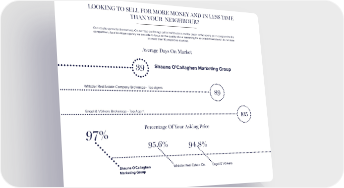 LOOKING TO SELL FOR MORE MONEY AND IN LESS TIME THAN YOUR NEIGHBOUR? Our results speak for themselves. On average our listings sell in half the time and for closer to the asking price compared to the competition. As a boutique agency we are able to focus on the quality of our marketing for each individual client. I do not take on more than 10 properties at a time. Average Days On Market 39 Shauna O’Callaghan Marketing Group Whistler Real Estate Company Brokerage - Top Agent 89 Engel & Völkers Brokerage - Top Agent 105 97% Percentage Of Your Asking Price 95.6% 94.8% Shauna O'Callaghan Whistler Real Estate Co. Engel & Völkers Marketing Group