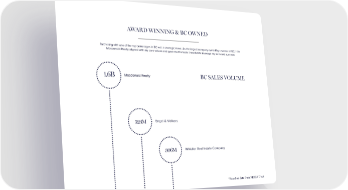 AWARD WINNING & BC OWNED Partnering with one of the top brokerages in BC was a strategic move. As the largest company owned by a woman in BC, I felt Macdonald Realty aligned with my core values and gave me the tools I needed to leverage my skills and succeed. 1.6B Macdonald Realty BC SALES VOLUME 523M Engel & Völkers 306M Whistler Real Estate Company *Based on data from REBGV 2018